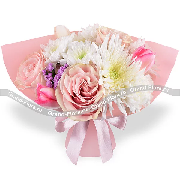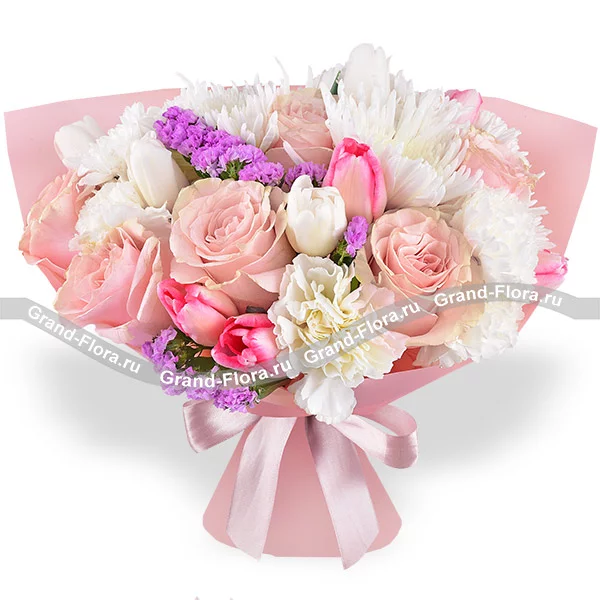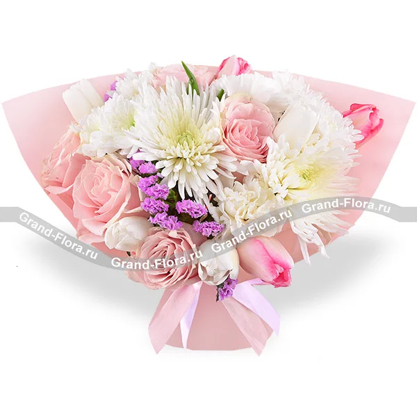 Стандартный: роза розовая - 5 шт., хризантема кустовая белая - 2 шт., хризантема одноголовая белая - 2 шт., гвоздика белая - 3 шт., тюльпан розовый - 3 шт., тюльпан белый - 4 шт., статица, упаковка, лента. Примерный размер: 30Х30 см.